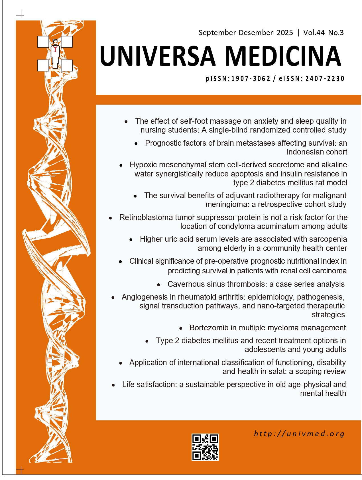 Universa Medicina (UnivMed) is an official scientific publication of the Faculty of Medicine Universitas Trisakti and is a peer-reviewed open-access journal. Universa Medicina is a four-monthly medical journal that publishes new research findings on a wide variety of topics of importance to biomedical science and clinical practice. Universa Medicina is a general medical journal that focuses on all aspects of human health.